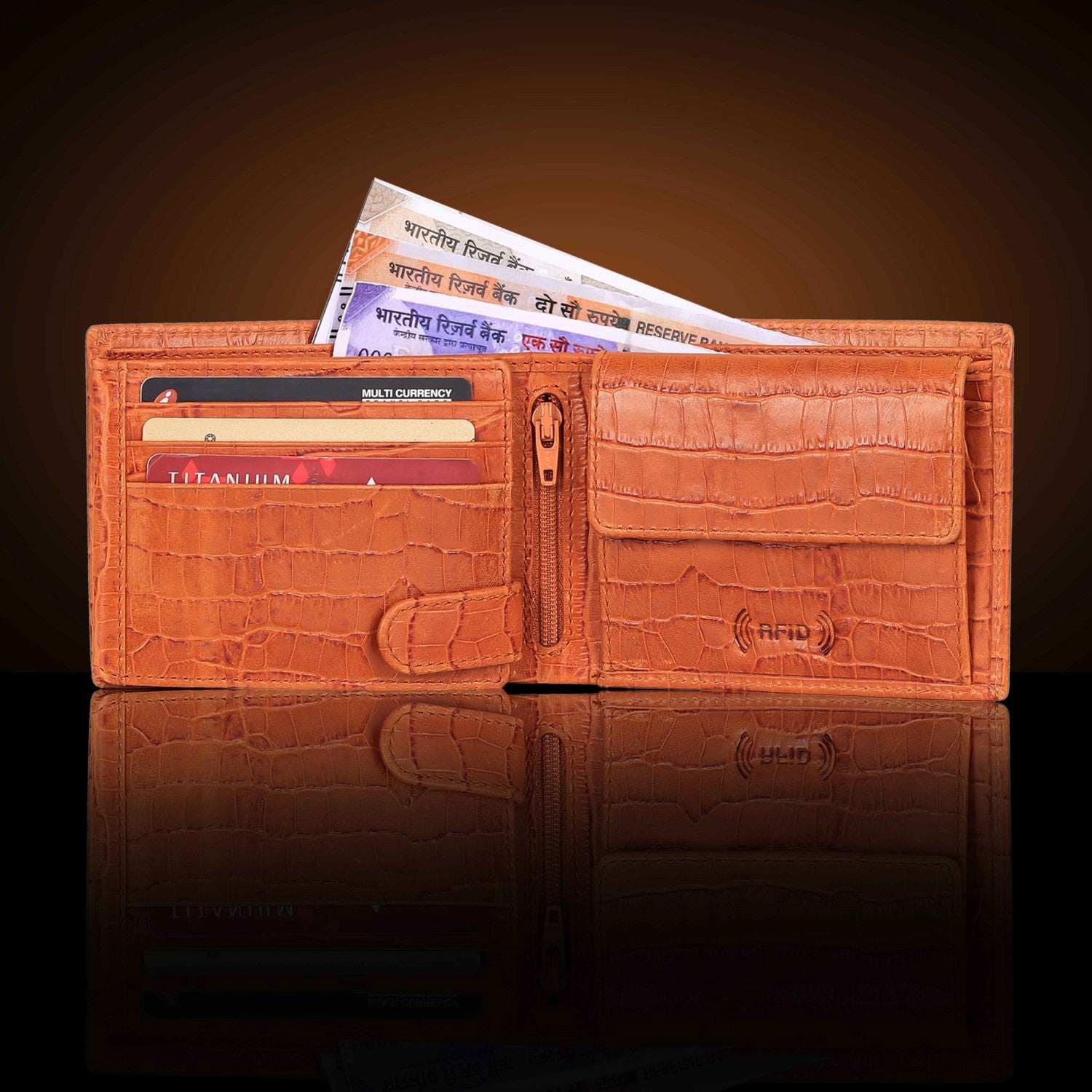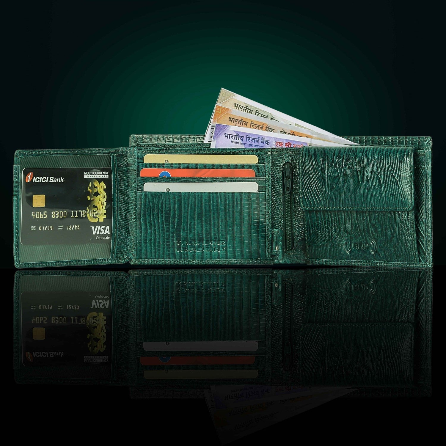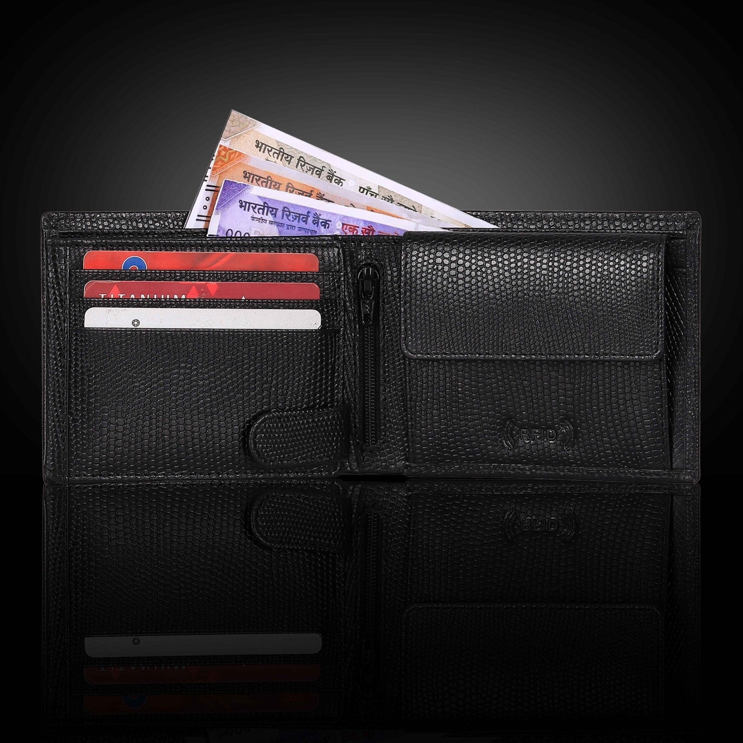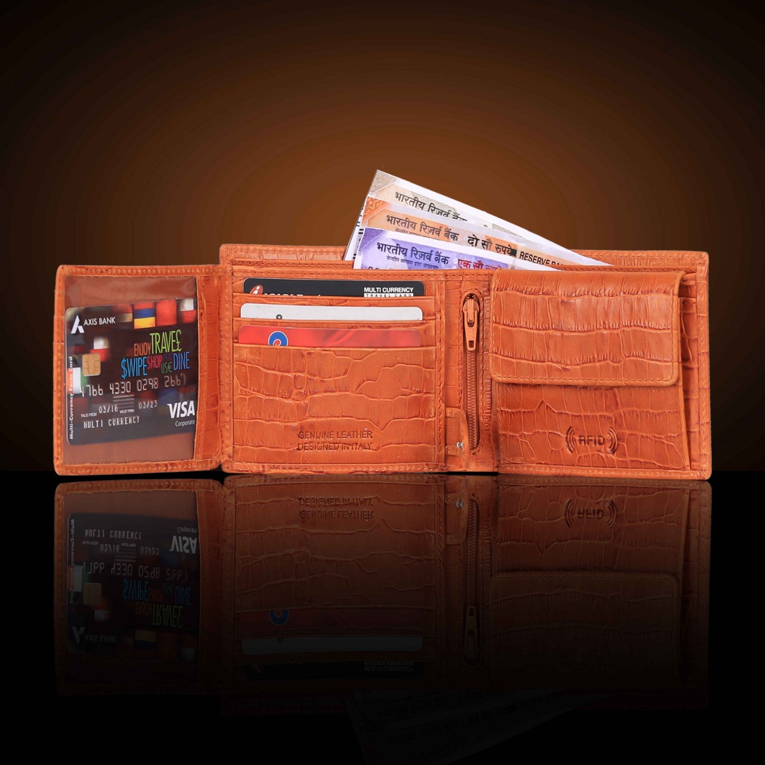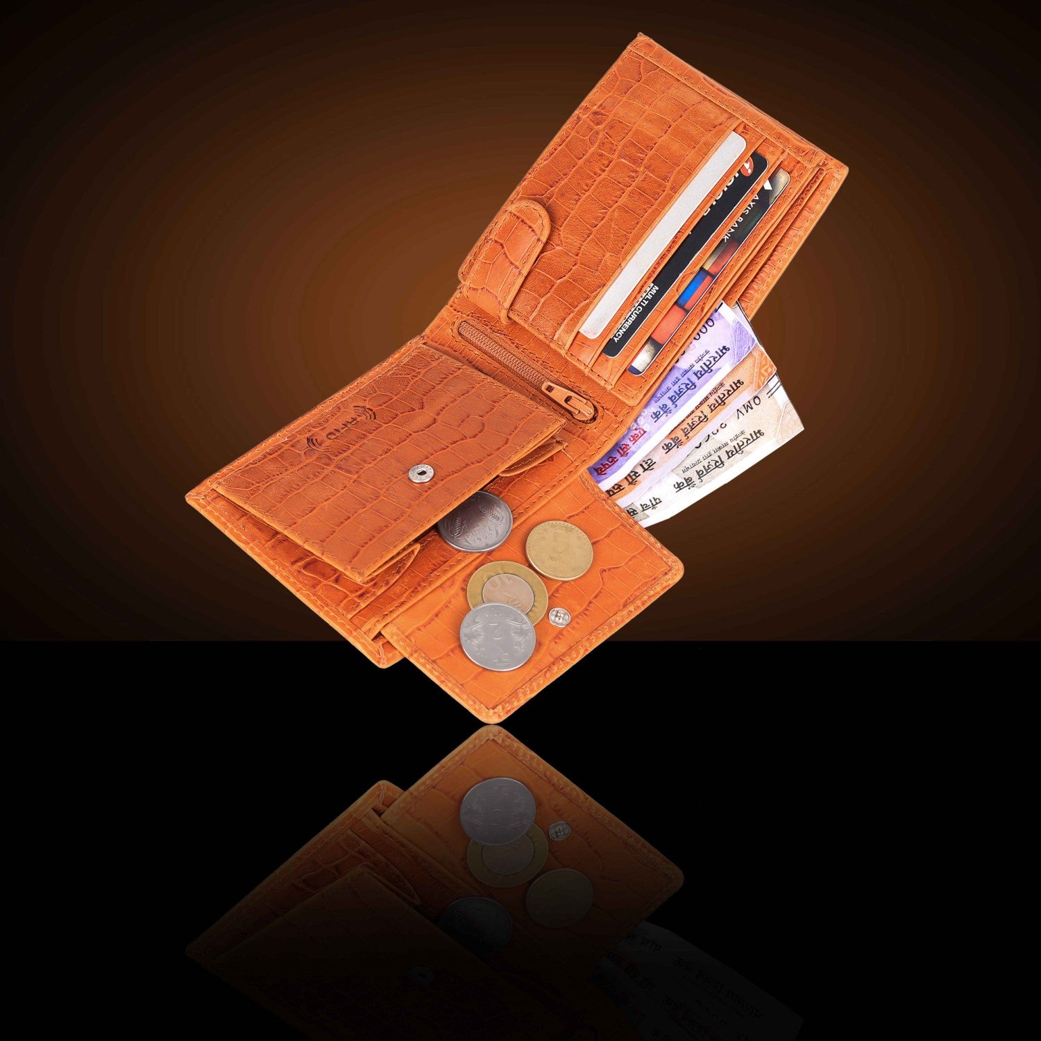 Presenting a high quality trendy & stylish Genuine Leather Bi-fold wallet from the HOUSE OF BULLZANO. Fully handmade this exclusive BULLZANO NILE leather wallet for men comes with 6 credit card slots, 1 hidden compartment, 1 transparent window for all your IDs, 2 currency slots, 1 specious coin , 1 zip pocket in the centre. Its Italian design ensures a comfort able fit in any pocket. It is fully RFID protected for total security from data theft. This wallet is made out of real leather and variation in colour is leather's natural quality, so proves that it is genuine leather. GIFT BOXED: This wallet comes in an elegant black BULLZANO gift box