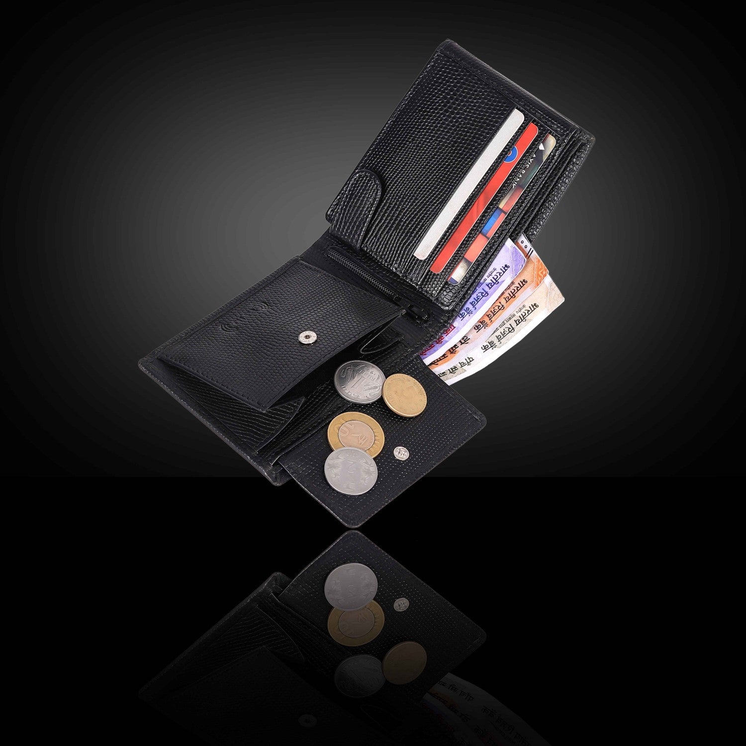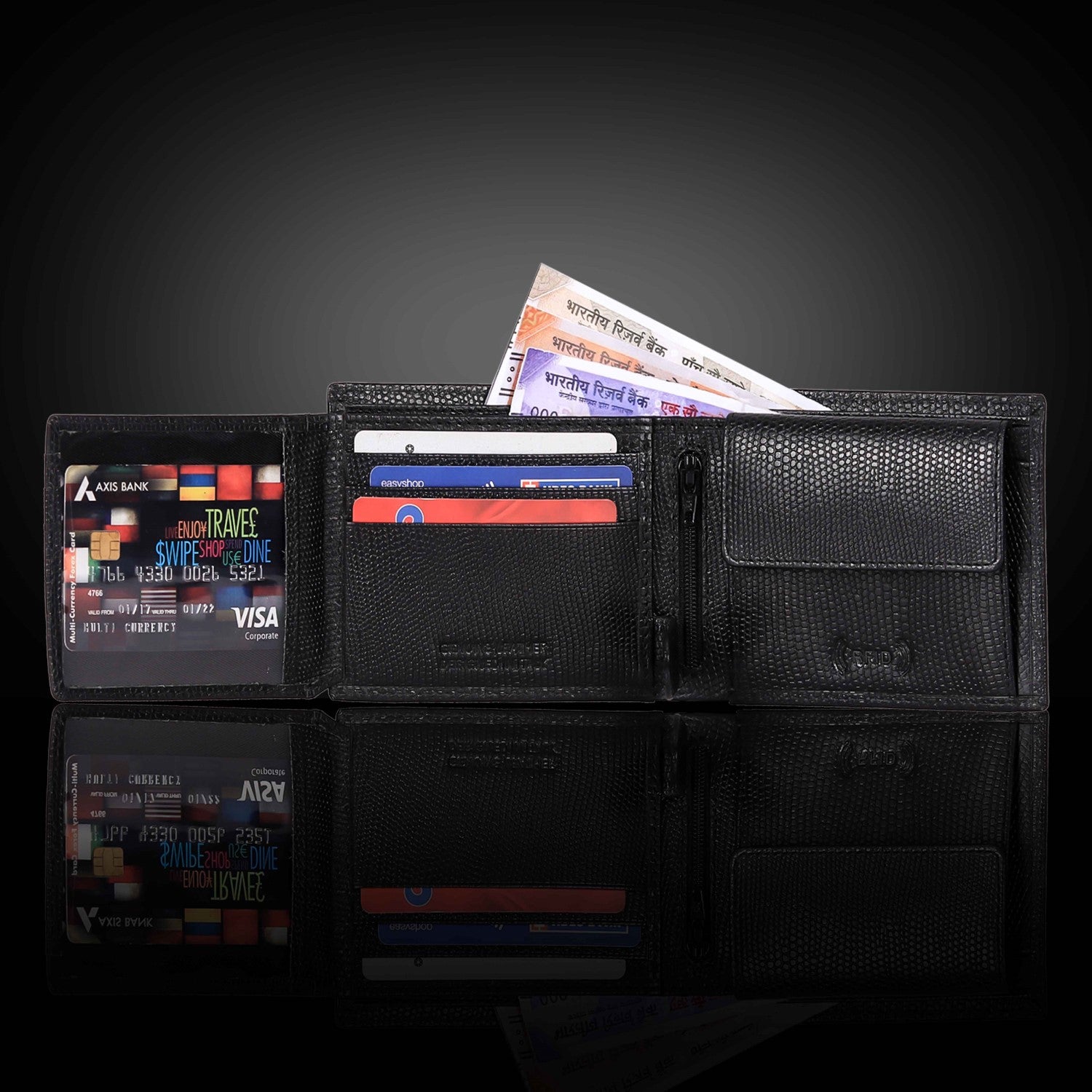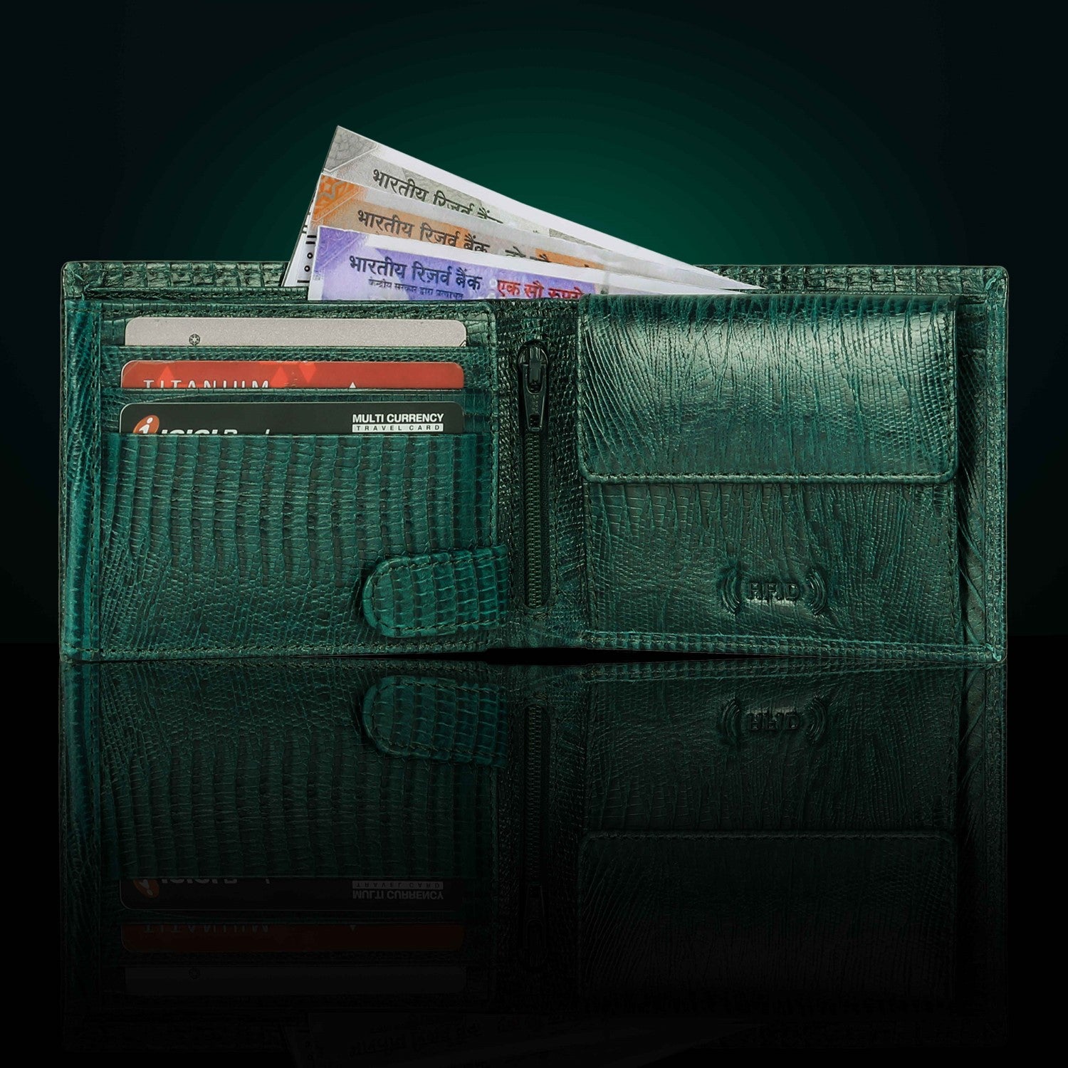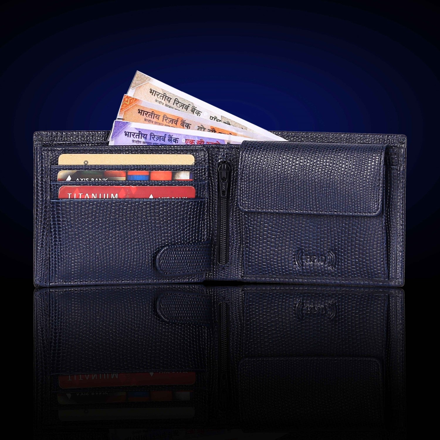 Presenting a high quality trendy & stylish Genuine Leather Bi-fold wallet from the HOUSE OF BULLZANO. Fully handmade this exclusive BULLZANO NILE leather wallet for men comes with 6 credit card slots, 1 hidden compartment, 1 transparent window for all your IDs, 2 currency slots, 1 specious coin , 1 zip pocket in the centre. Its Italian design ensures a comfort able fit in any pocket. It is fully RFID protected for total security from data theft. This wallet is made out of real leather and variation in colour is leather's natural quality, so proves that it is genuine leather. GIFT BOXED: This wallet comes in an elegant black BULLZANO gift box